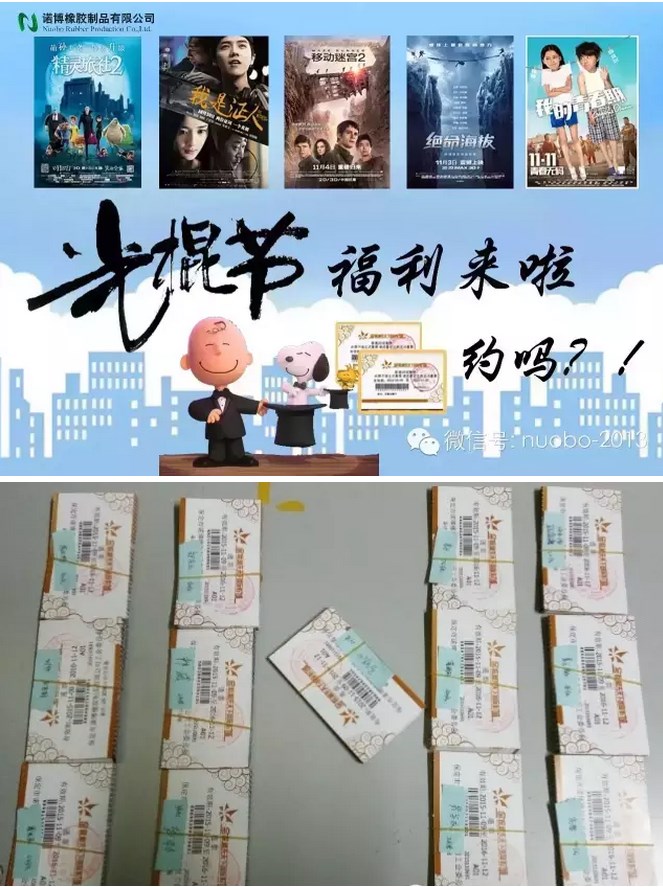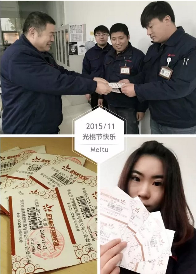 一年一度的光棍节终于来临啦,为体现员工关怀,保定诺博于11月10日为在岗员工发放了两张电影票(10月1日之后入职的发放了一张电影票),公司希望单身员工在节日期间尽快“脱单”,其他员工可以陪着家人一起观看电影,一同感受节日氛围。