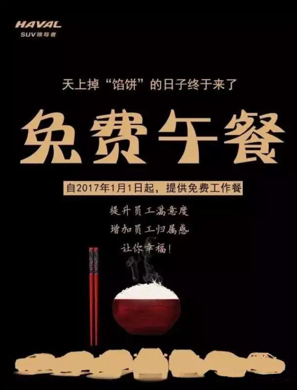 2016年12月30日集团内发布了《关于工作餐免费的通知》,主要内容为自2017年1月1日起,员工上班期间工作餐免费,其目的是提升员工满意度及幸福感!详情可关注OA具体通知要求哦!