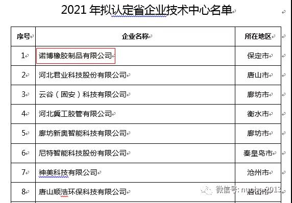 2021年9月,诺博橡胶技术中心通过“河北省企业技术中心”认定(8月19日完成省发改委组织的专家答辩,9月7日完成公示)。这是诺博橡胶继获评“河北省汽车减震与密封橡胶产品技术创新中心”后,所获得的又一重要科研能力资质认定。