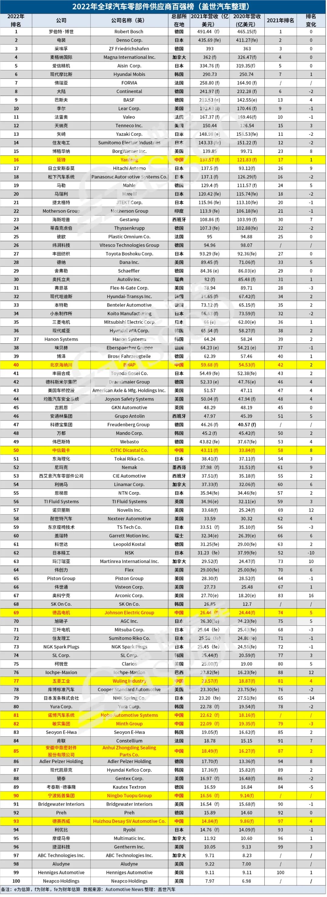 北京时间6月27日,《美国汽车新闻》(Automotive News)发布了2022年全球汽车零部件供应商百强榜。根据最新榜单,前5名仍旧是博世、电装、采埃孚、麦格纳国际、爱信精机;现代摩比斯的排名从去年的第7名上升1名;佛吉亚和海拉合并后的新集团佛瑞亚排在第7名;在纬湃科技拆分出去之后,大陆集团名次下滑2名至第8名;巴斯夫也进入前十;李尔的排名微跌至第10。
