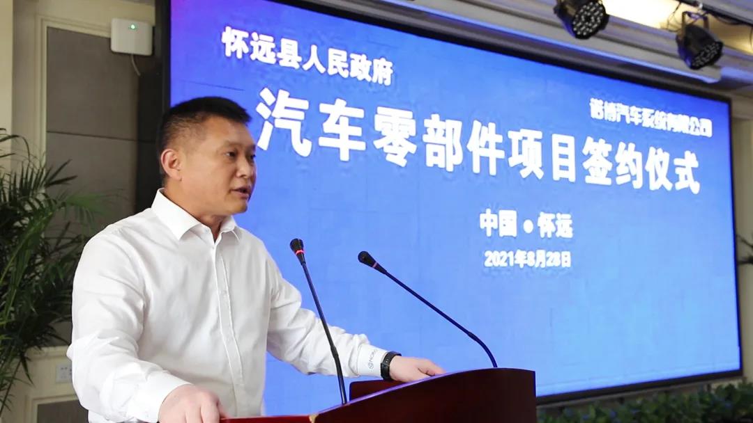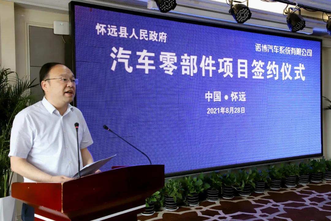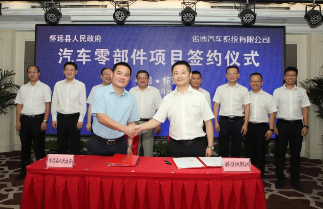 8月28日,诺博汽车系统有限公司(简称“诺博汽车”)与怀远县人民政府(简称“怀远县”)正式签署投资合作协议,双方就诺博汽车于怀远投资建设汽车零部件项目达成一致意见,诺博汽车战略布局再次扩大升级。蚌埠市副市长陈忠卫,怀远县委书记汪若怀,诺博汽车董事长郑春来,怀远县委副书记、县长高东升,诺博橡胶总经理李嵬,诺博汽车战略规划总监冯东升等出席签约仪式,由怀远县委副书记杨亮主持本次签约仪式。